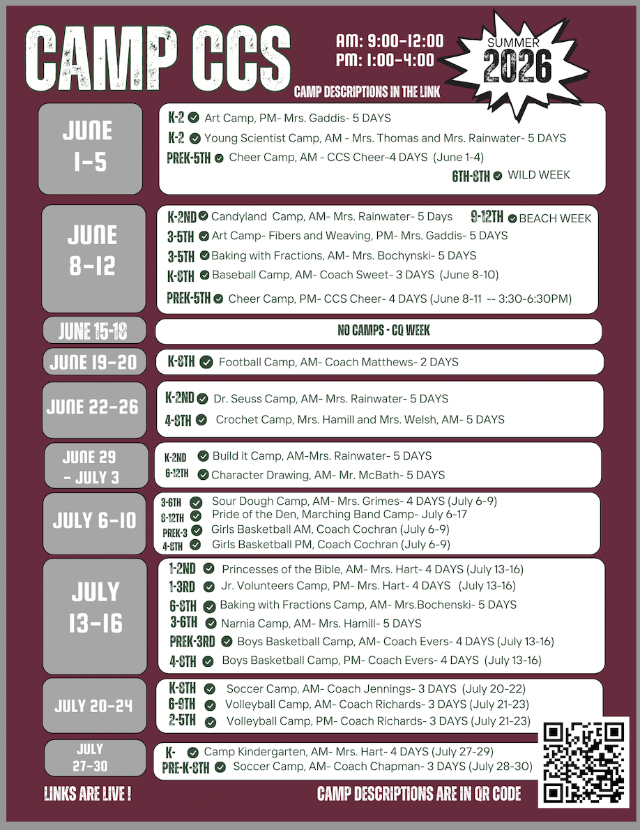 Camp CCS will run June 1st – July 30th and offer a wide variety of experiences in art, athletics, and academics.
